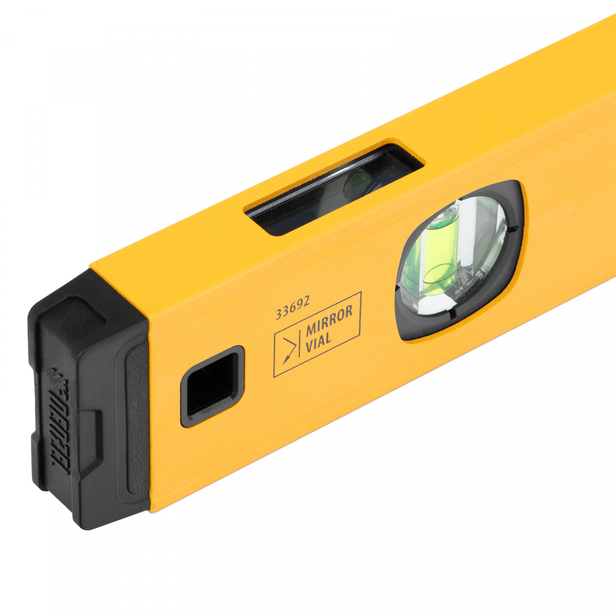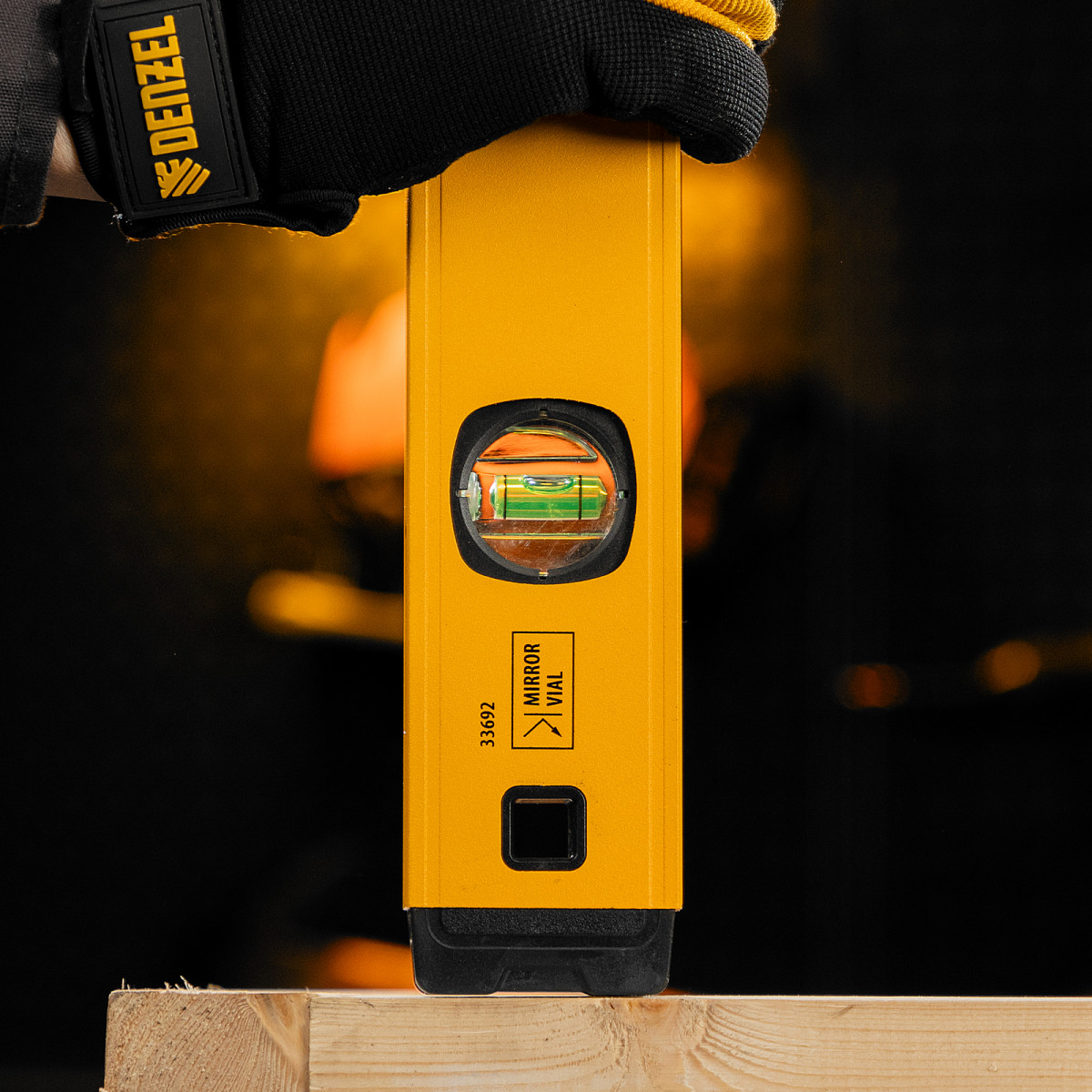 Алюминиевый фрезерованный уровень Denzel 33692 длиной 800 мм, с магнитом и 3 глазками, из которых 1 зеркальный, предназначен для контроля отклонений от горизонтальной, вертикальной и поверхности под углом 45° с точностью 0,5 мм/м. 3 пузырьковые камеры 90°, 180° и 45° позволяют быстро проверить правильность разметки. Инструмент незаменим при проведении строительных, ремонтных, сантехнических работ.