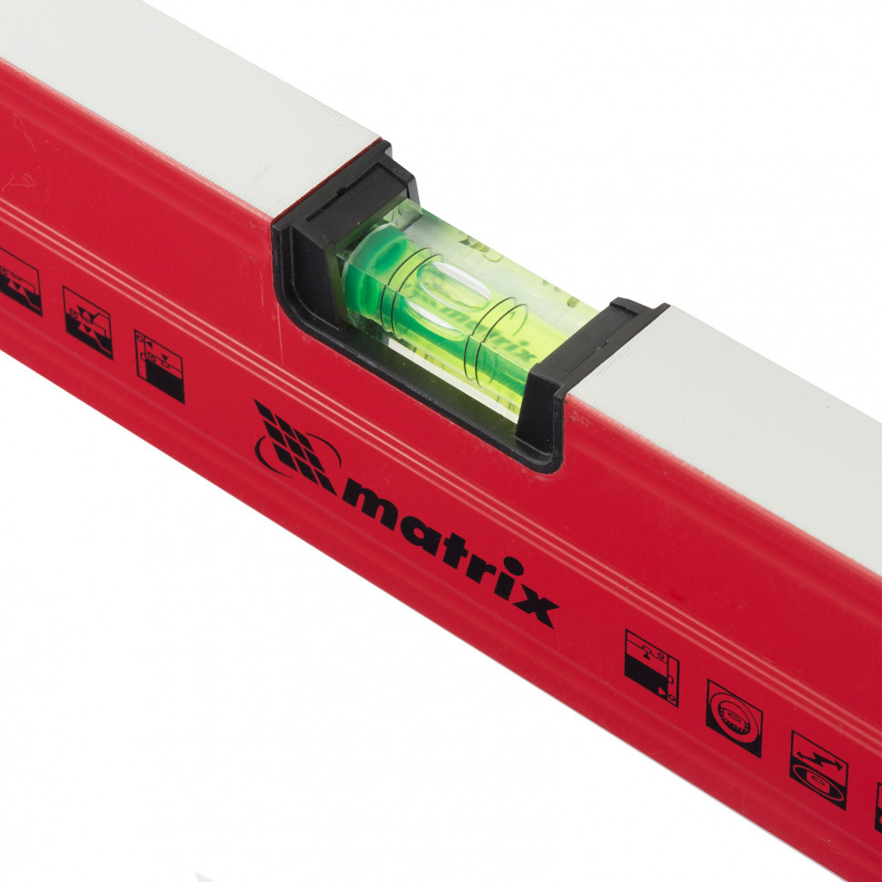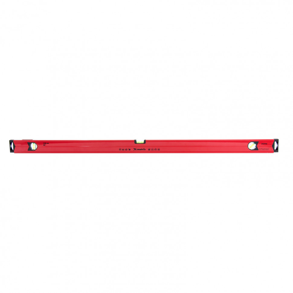 Уровень алюминиевый магнитный Matrix 34712 усиленной конструкции, длиной 1200 мм, с фрезерованной рабочей поверхностью, оснащен 3 глазками и одним зеркальным отражателем. Позволяет выявить отклонения от вертикали, горизонтали и угла 45°. Встроенный зеркальный глазок облегчает считывание показаний.