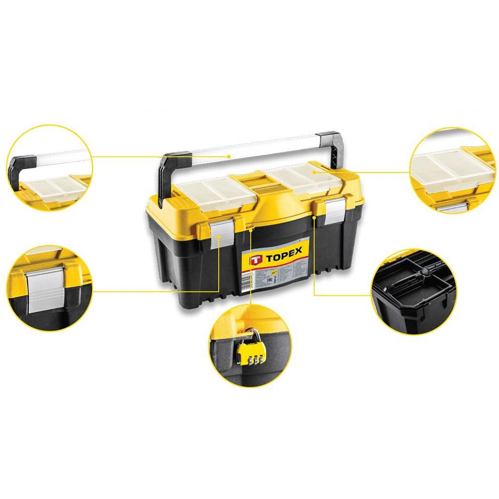 Ящик для инструмента TOPEX 22" 79R128 используется для хранения и транспортировки ручного инструмента. На крышке расположены 2 практичных органайзера для хранения мелочей. При изготовлении используется прочный пластик, обеспечивающий длительный срок эксплуатации. Застежки и ручка выполнены из алюминия. Предусмотрены петли для навесного замка.