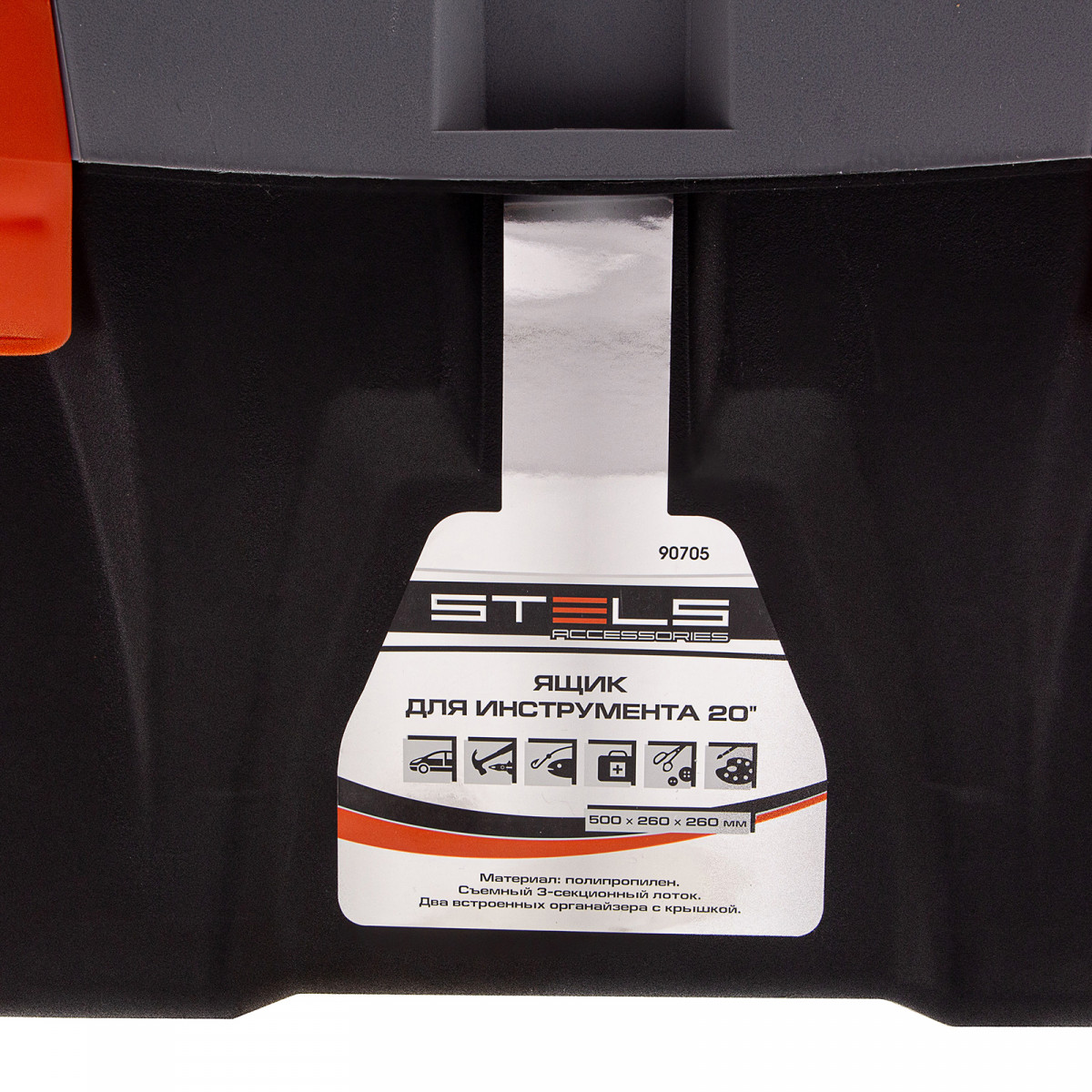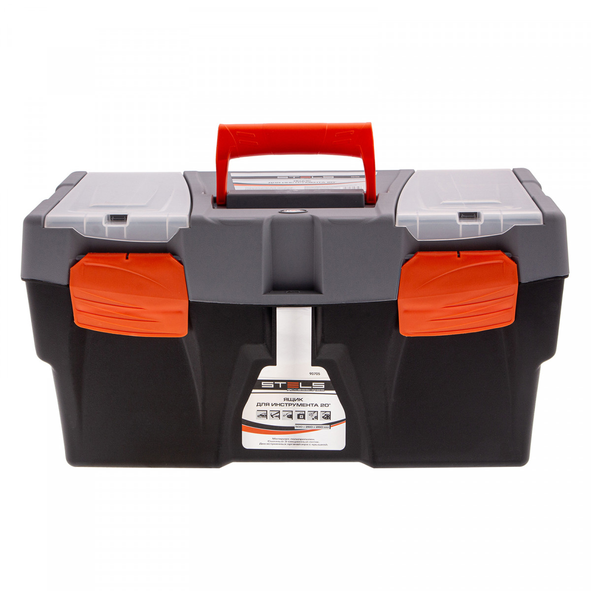 Ящик для инструмента Stels 90705, 20 дюймов, габаритами 500 х 260 х 260 мм, из пластика, предназначен для переноски и хранения инструментов, хозяйственных мелочей, рыболовных снастей. Содержимое не рассыпется, поскольку он надежно закрывается. Встроенные в крышку отделения обеспечивают быстрый доступ к крепежам и другим необходимым предметам. Большой ящик для хранения инструментов будет полезен дома, на даче, в гараже и на рыбалке.