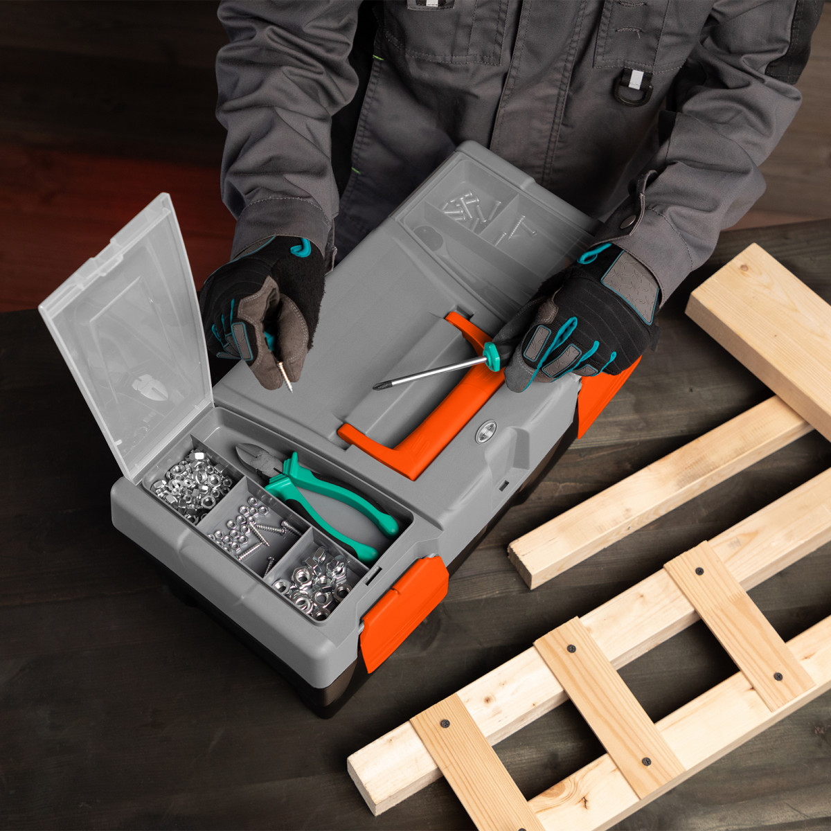 • В ящике имеется съемный лоток, что позволяет удобно расположить инструменты разного размера, а также крепежи и мелкие детали.