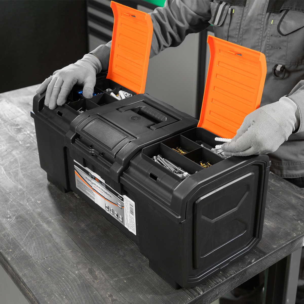 • Упорядоченное хранение крепежа и мелких деталей — в крышке имеются специальные органайзеры, также в комплект поставки входит съемный лоток с ручкой.