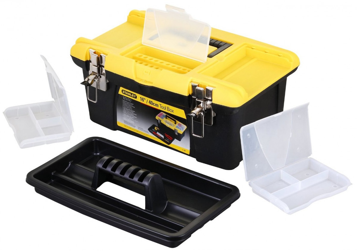 Ящик для инструмента Stanley JUMBO 1-92-908 - это вместительный контейнер, который обладает легкой пластиковой конструкцией. Съемный лоток расположен под крышкой. На крышке предусмотрен органайзер для хранения мелочей и удобная для транспортировки крышка. Металлические защелки обеспечивают сохранность инструментов. Размер - 22".