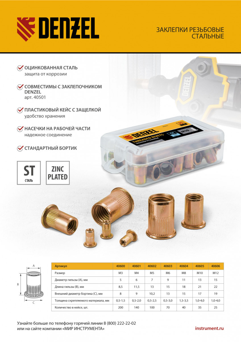 Стальные резьбовые заклепки Denzel выдерживают значительные нагрузки благодаря материалу изготовления.