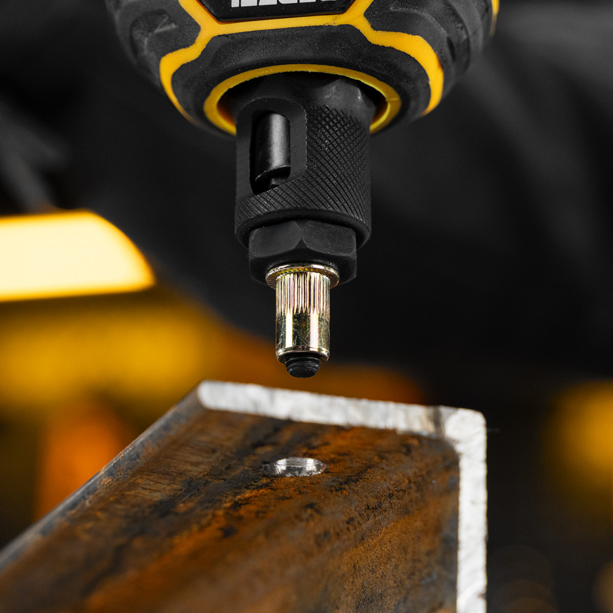 - Удобное хранение и транспортировка — заклепки поставляются в прочном пластиковом кейсе с защелкой.