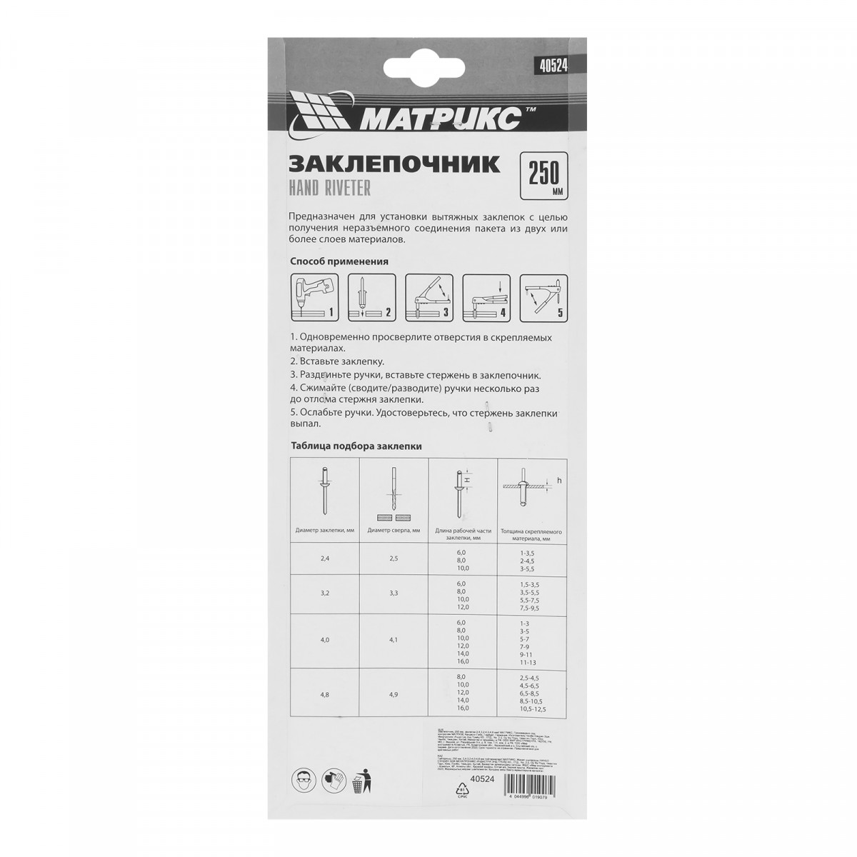 Заклепочник, 250 мм, заклепки 2.4-3.2-4.0-4.8 мм Матрикс
