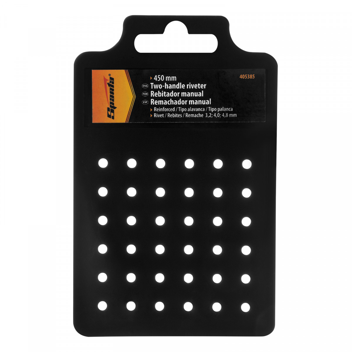 Двуручный усиленный заклепочник Sparta 405385 длиной 450 мм используется для скрепления металлических листов с помощью заклепок 3,2-4,0-4,8 мм. Он обеспечивает высокую производительность работы, т.к. требует меньше усилий от мастера в сравнении с одноручным инструментом. Благодаря усиленной конструкции инструмент рассчитан на высокие нагрузки.