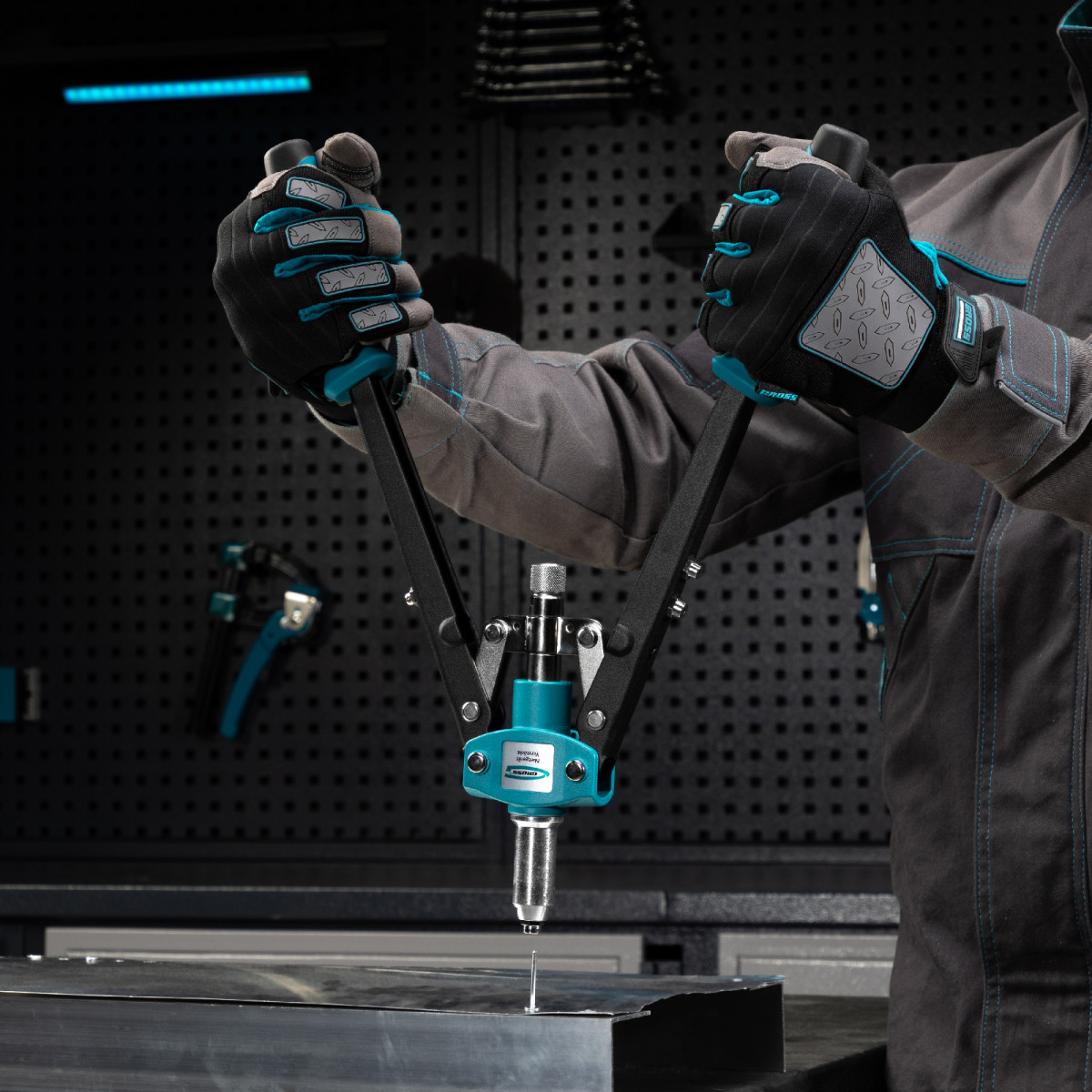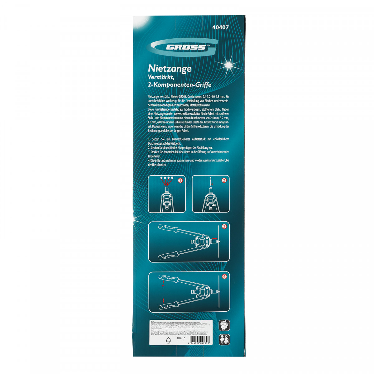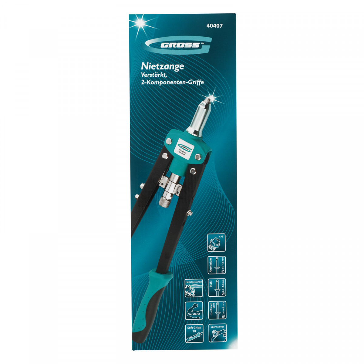 Заклёпочник двуручный Gross 40407 с двухкомпонентными рукоятками, 420 мм, предназначен для соединения листовых заготовок, металлопрофиля, легких строительных конструкций и плоских деталей. Применяется с алюминиевыми, стальными и нержавеющими заклёпками 2,4-3,2-4,0-4,8 мм, для которых предусмотрены сменные насадки. Заклёпочник используется при проведении строительных и ремонтных работ, в производстве мебели, бытовой и оргтехники, а также для ремонта автомобилей.