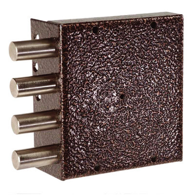 Замок накладной сувальдный. Предназначен для установки на металлические двери. Засов из четырех цилиндрических ригелей диаметром 18,5 мм, с максимальным вылетом 40 мм. Удаление ключевого отверстия - 64 мм. Количество полуоборотов ключа - 4. Габариты замка - 135х146х32,5 мм. Односторонний замок - открывается и закрывается только с внешней стороны. Защита от вскрытия замка отмычкой, защита от высверливания стойки ригеля и защита от вскрытия методом проворота.