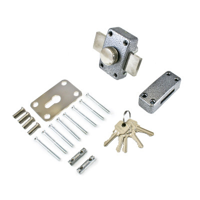 Замок накладной цилиндровый с вертушкой. Предназначен для установки на деревянные двери. Засов - цельный прямоугольный стальной ригель, общей длиной 114мм. Габариты корпуса замка - 90х56мм. Комплектация - 5 ключей, запорная планка со стяжками, наружная накладка со стяжными болтами. Механизм замка под англ.ключ, идет совместно с корпусом. Закрывание и открывание замка изнутри производится вертушкой, снаружи ключом. Имеет фиксатор, которым можно полностью блокировать замок. Совпадает по посадочным отверстиям с замком ELP Казань.