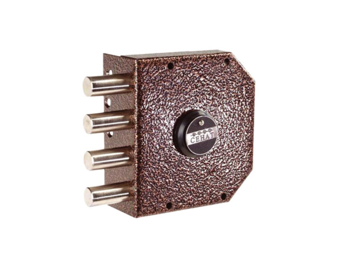 Замок накладной сувальдный. Предназначен для установки на металлические двери. Засов из четырех цилиндрических ригелей диаметром 18 мм, с максимальным вылетом 40 мм. Удаление ключевого отверстия - 64 мм. Количество полуоборотов ключа - 4. Габариты замка - 135х146х32,5 мм. Защита от вскрытия замка отмычкой, защита от высверливания стойки ригеля и защита от вскрытия методом проворота. Имеет накладку с внутренней стороны на замочной скважине и пластмассовую направляющую под ключ.