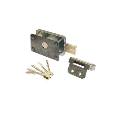 Замок накладной, цилиндровый под крест.ключ, для установки на металлические двери. Засов из прямоугольного ригеля размерами (ширина-высота) 10-40 мм, с максимальным вылетом 50 мм. Удаление ключевого отверстия - 77 мм. Габариты замка -90х153х64 мм. Комплектация - 5 крестовых ключей, запорная коробка, накладка. Защита от высверливания и вскрытия замка.