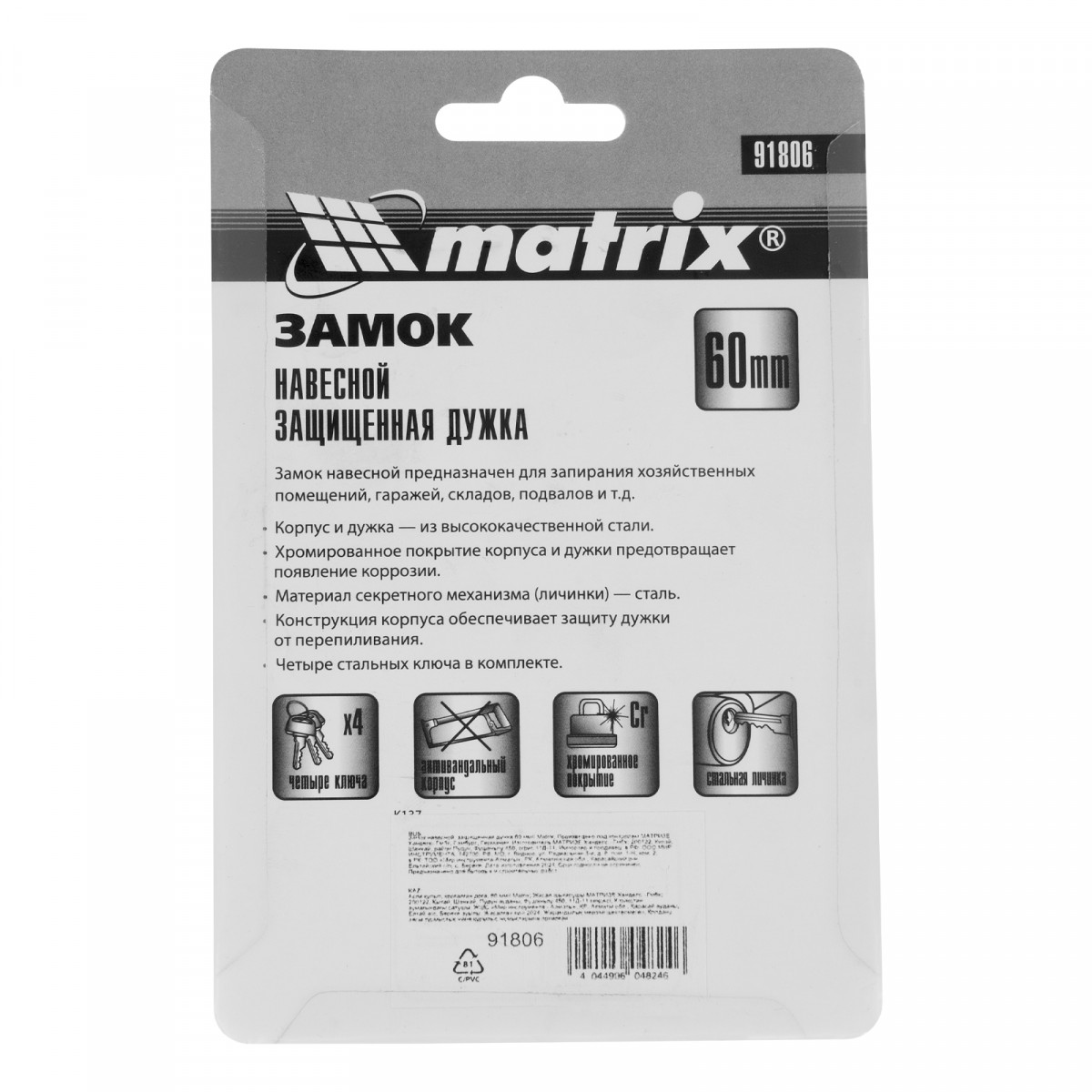 Замок навесной, защищенная дужка 60 мм Matrix